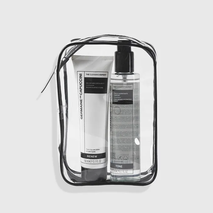 La Rutina Renovadora de la línea The Cleansing Expert de Germaine de Capuccini es ideal para quienes desean una piel más lisa, luminosa y uniforme a diario. Combina la 365 Espuma Exfoliante, que limpia y exfolia suavemente cada día, con el Tónico Hidratante Confort, que equilibra, hidrata y calma la piel tras la limpieza.